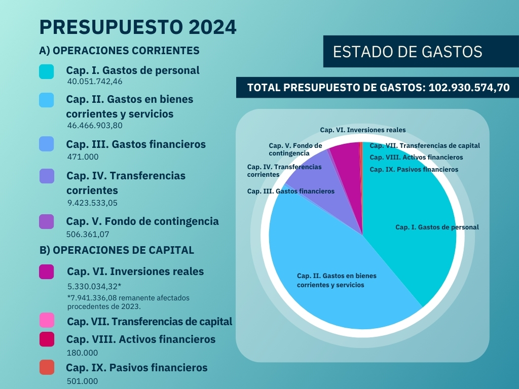 En el capítulo de gastos corrientes en bienes y servicios, el Presupuesto asciende a 46.466.903,80 euros. El objetivo es afrontar las principales demandas de los vecinos y vecinas, con un cálculo ponderado de las cantidades dedicadas a los servicios más relevantes: la limpieza de las calles (con 5,6 millones de euros destinados a limpieza, un 10% más que en el último ejercicio) y la recogida de residuos (otros 5,7 millones de euros, un 60% más que en el último ejercicio); el incremento y mejora de la seguridad ciudadana (que contempla 20 plazas más de agentes de Policía Local); la calidad de los servicios educativos (3,4 millones, un 21% más) y culturales (más de 1,1 millones de euros, un 24% más); o políticas de igualdad (517.852 euros, lo que supone un incremento del 39%).