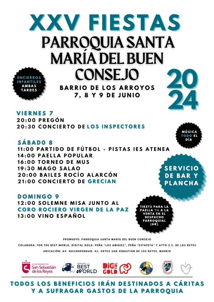 El 7 de junio comienzan las fiestas del Barrio de los Arroyos. Será la edición número 25 de esta cita anual de esta zona de San Sebastián de los Reyes. El evento lo promueve la Parroquia Santa María de Buena Consejo (avenida Navarrondán, 43).