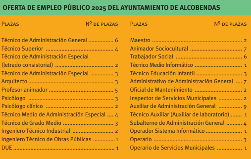 El Ayuntamiento de Alcobendas ha aprobado la Oferta de Empleo Público (OEP) 2025, con el objetivo de seguir avanzando en la creación de empleo público de calidad, fomentar la inclusión, atraer talento y  modernizar su plantilla municipal. Esta nueva convocatoria contempla un total de 88 plazas, que, sumadas a las 24 plazas para el Cuerpo de la Policía Local aprobadas en febrero, elevan la oferta total del año a 112 puestos de trabajo, consolidando el compromiso del Consistorio con el fortalecimiento