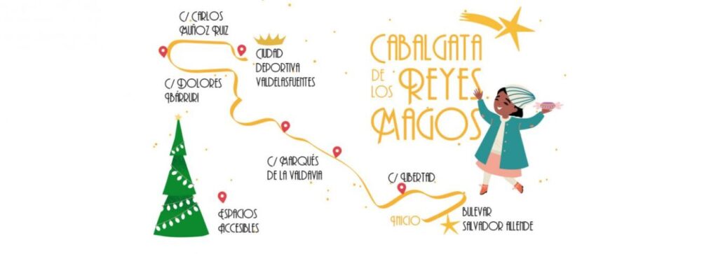 La Cabalgata partirá a las 18 h desde el Bulevar Salvador Allende. El itinerario recorrerá las calles Mariano Sebastián Izuel, Libertad, Marqués de la Valdavia y Manuel de Falla. Desde aquí, comienza la novedad del recorrido que bajará por la calle Miguel de Cervantes, girará a la izquierda por Dolores Ibárruri, continuará por la Avenida de Pablo Iglesias, la calle Carlos Muñoz Ruiz y, de nuevo, Miguel de Cervantes, para acabar en la explanada de la Ciudad Deportiva Valdelasfuentes entre las 20 y las 20:30 h, aproximadamente, según el paso de las carrozas. Más info aquí: