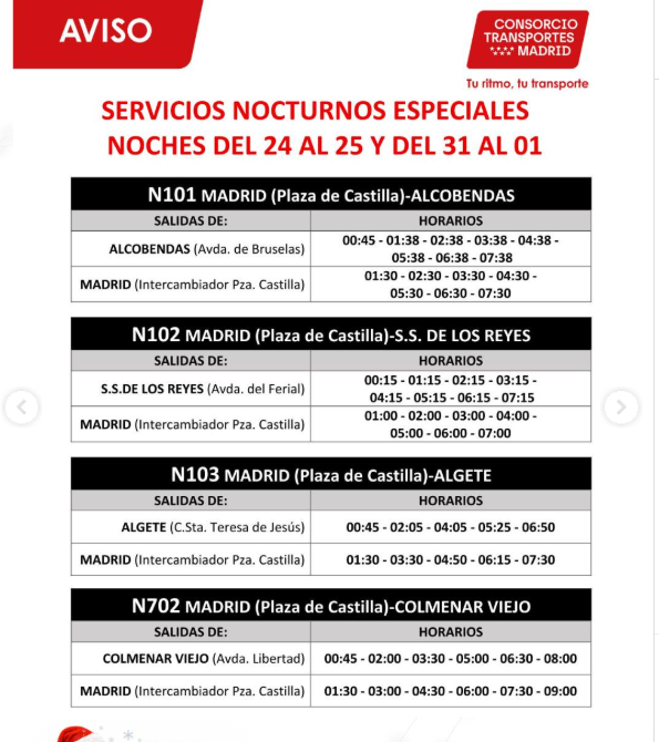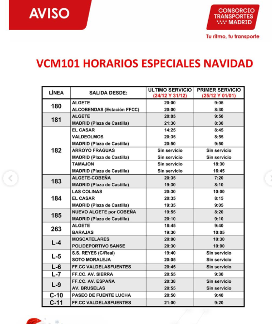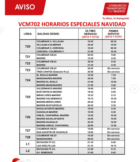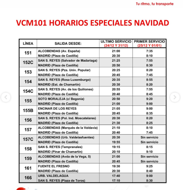 Interbus ha publicado en sus redes sociales los horarios de su último servicio en Nochebuena y Nochevieja y el primero para Navidad y Año Nuevo. Estos datos afectan a los autobuses que pasan por Alcobendas y San Sebastián de los Reyes.