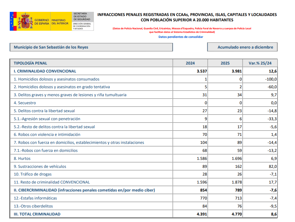 Magazine SLV. San Sebastián de los Reyes. Datos oficiales del Ministerio del Interior de todo el 2025 en comparación con 2024