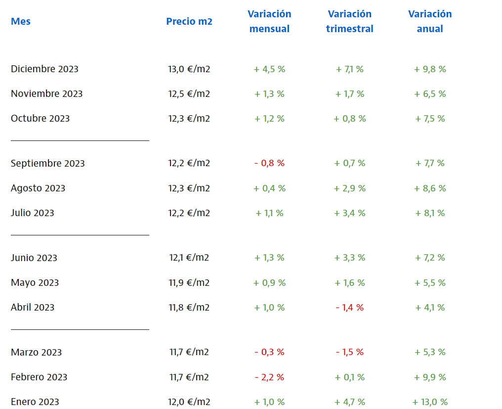 La misma tendencia se observa en Vega de la Moraleja. Caen los precios un 0,7% en diciembre de 2023 respecto a noviembre, pero suben un 5,2% en el último trimestre del año respecto al tercero.