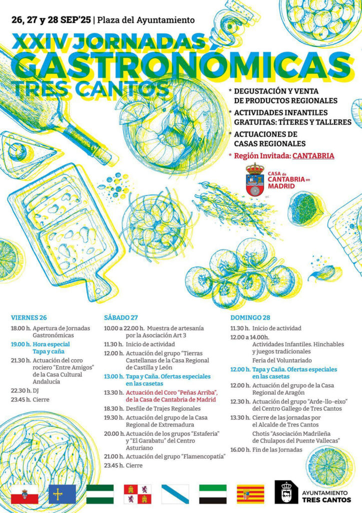 Organizadas por la Concejalía de Participación Ciudadana, las jornadas reúnen a casas regionales de Asturias, Andalucía, Castilla y León, Galicia, Extremadura y Aragón, que ofrecen degustaciones, venta de productos autóctonos, artesanía y actuaciones folclóricas. Este año, la Casa de Cantabria de Madrid participa como invitada de honor, aportando la esencia de su cocina y su cultura.