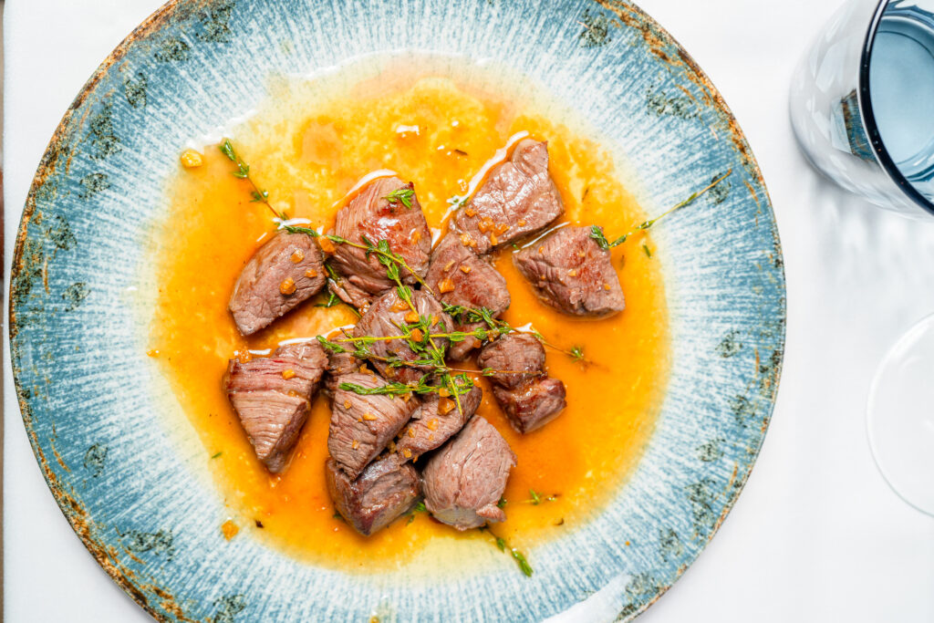 Antes de pasar al postre, también probamos los sensacionales daditos de solomillo salteados, acompañados de patatas fritas caseras. Un plato delicioso que disfrutamos plenamente antes de sucumbir a los encantos de la exquisita tarta árabe, un postre fino, delicado y nada pesado, que fue el broche perfecto para nuestra experiencia.