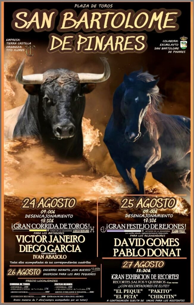 Magazine SLV. Toros. La localidad abulense de San Bartolomé de Pinares celebrará entre el 24 y el 27 de agosto sus fiestas patronales en honor a San Bartolomé, con una feria taurina que reunirá a figuras destacadas del toreo y del rejoneo. El Excmo. Ayuntamiento y la empresa taurina Tierra Castilla, dirigida por Tito Flores, han presentado una programación que incluye cuatro festejos: una corrida de toros, un festejo de rejones, una gran exhibición de recortes con suelta de reses y un encierro infantil.